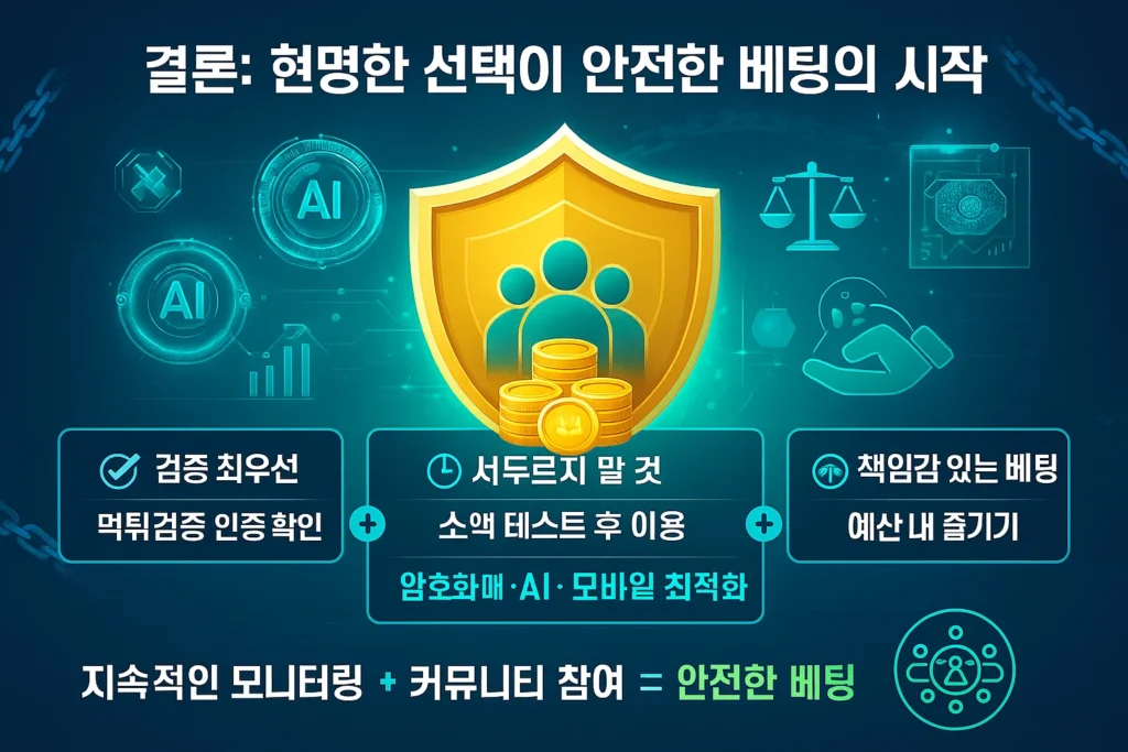 본 가이드에서 다룬 내용을 종합하면, 안전한 베팅 환경을 위한 핵심 원칙은 다음과 같습니다: